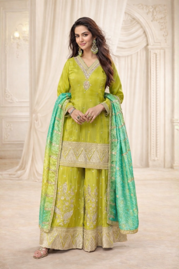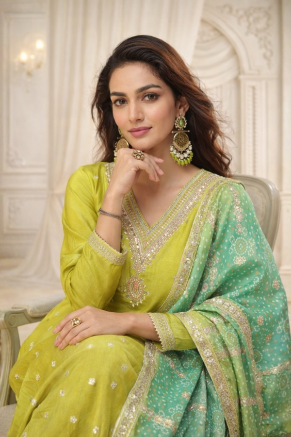 Green zari sequin embroidered sharara suit with bandhani dupatta