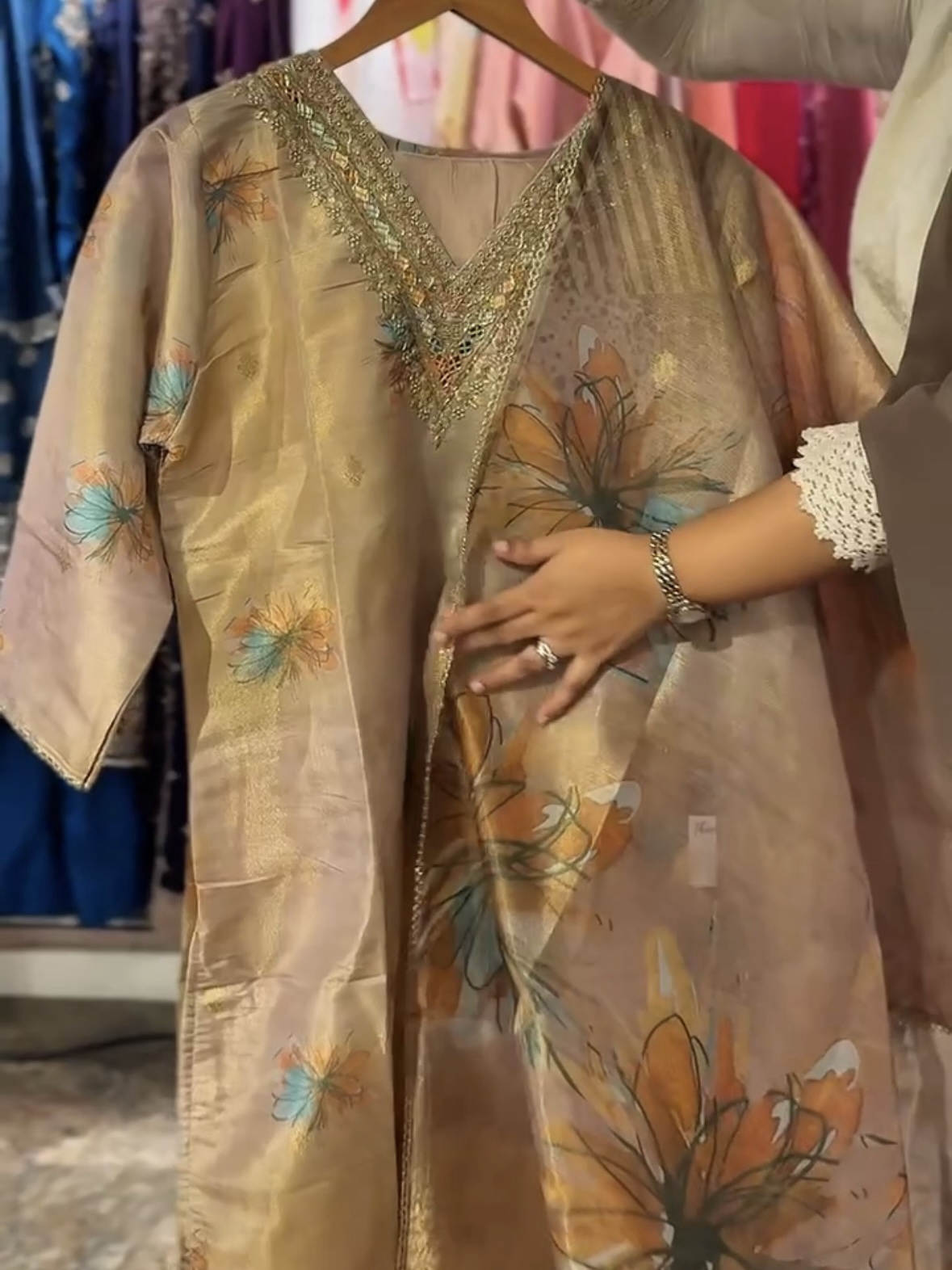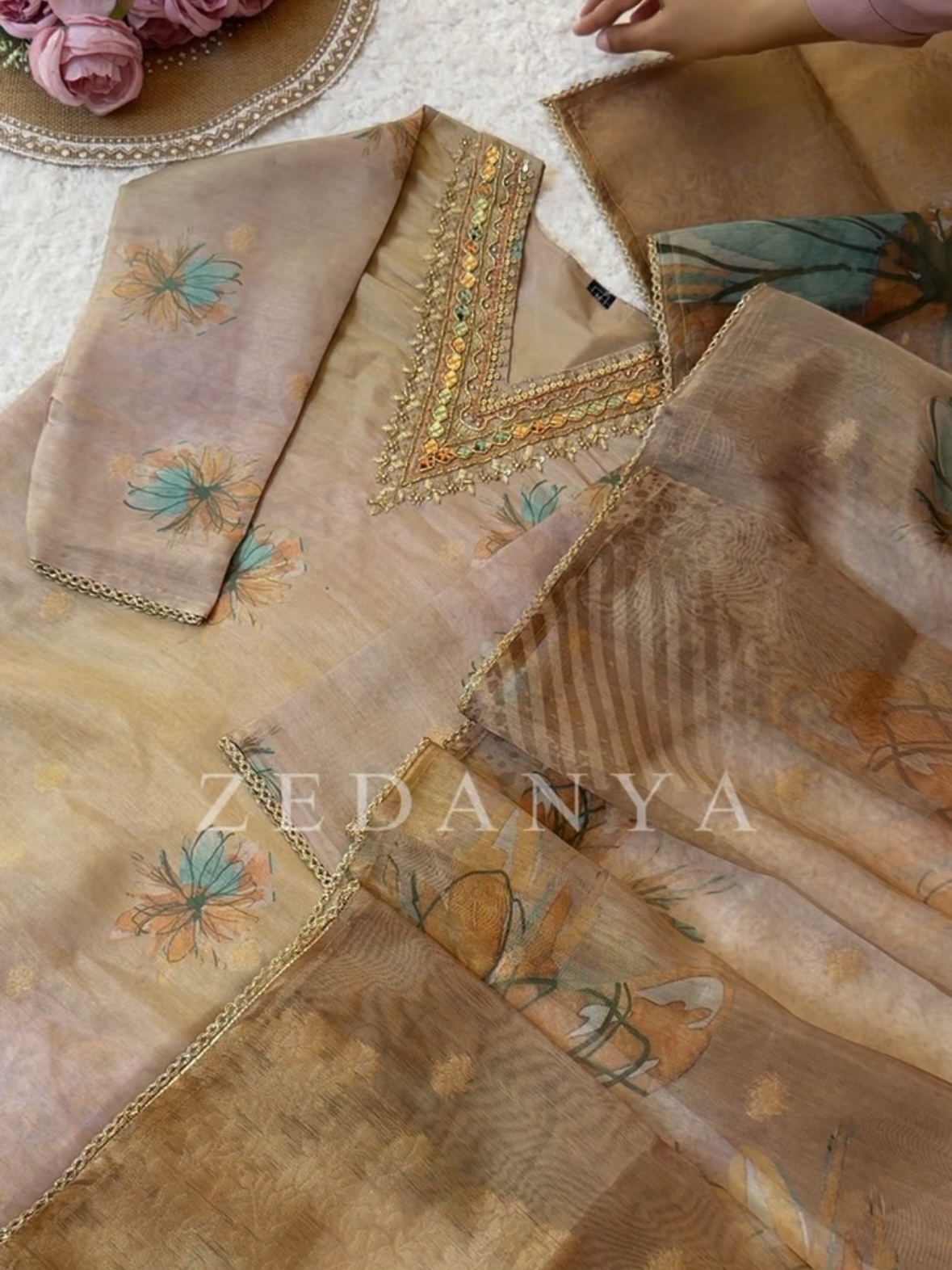 Brown floral print shimmer yoke embroidered shalwar suit by zedanya