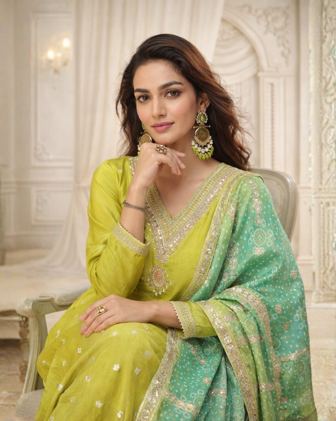 Green zari sequin embroidered sharara suit with bandhani dupatta