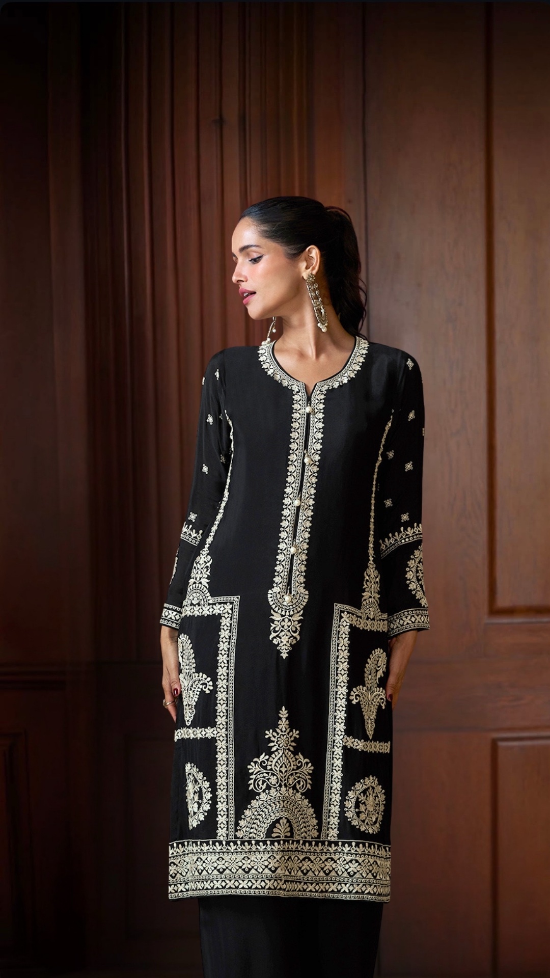 Black silk white embroidered designer suit – Zedanya Sri Lanka